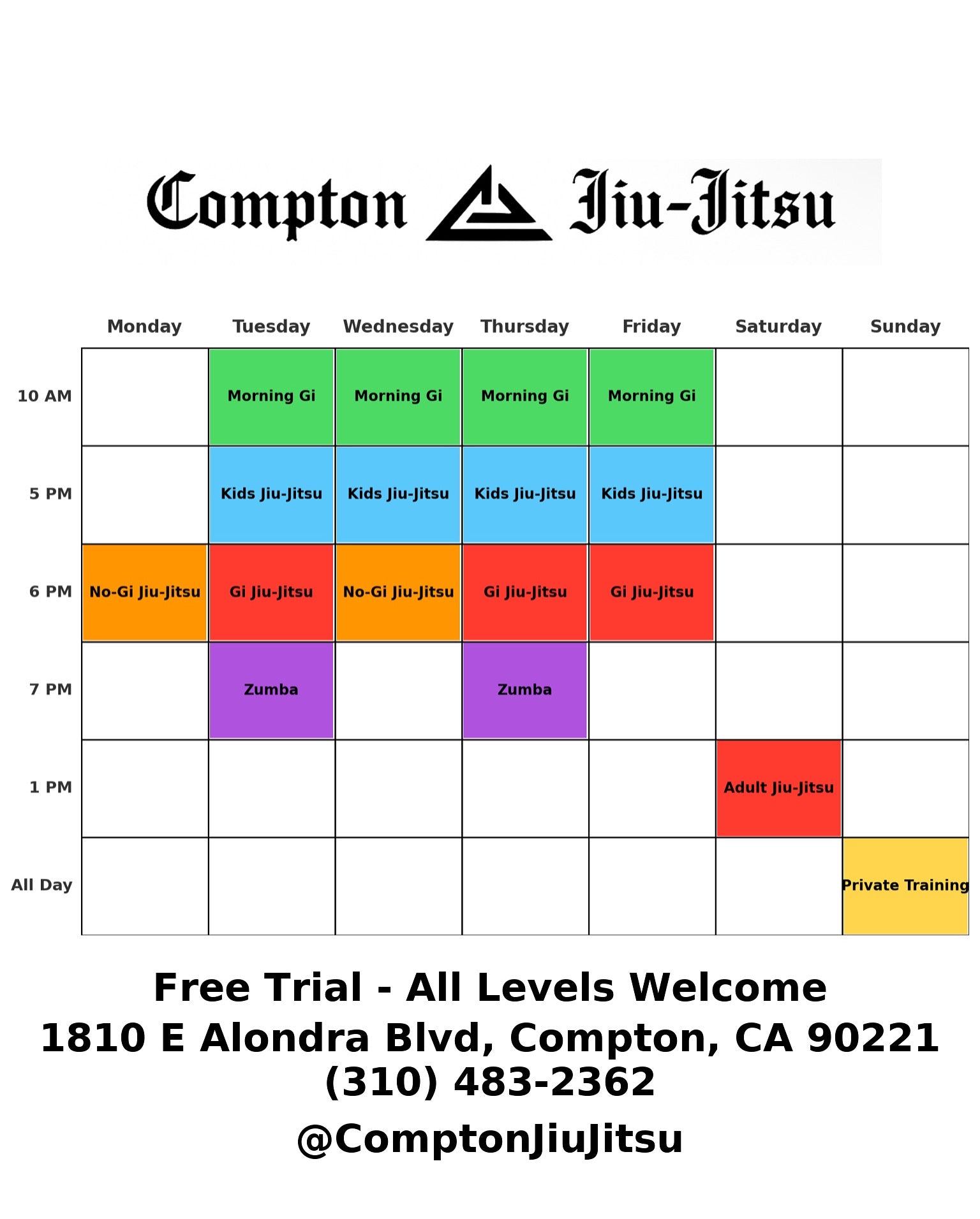 Current Schedule ✅ Website is still being worked on. Check our Instagram for more info . @Comptonjiujitsu